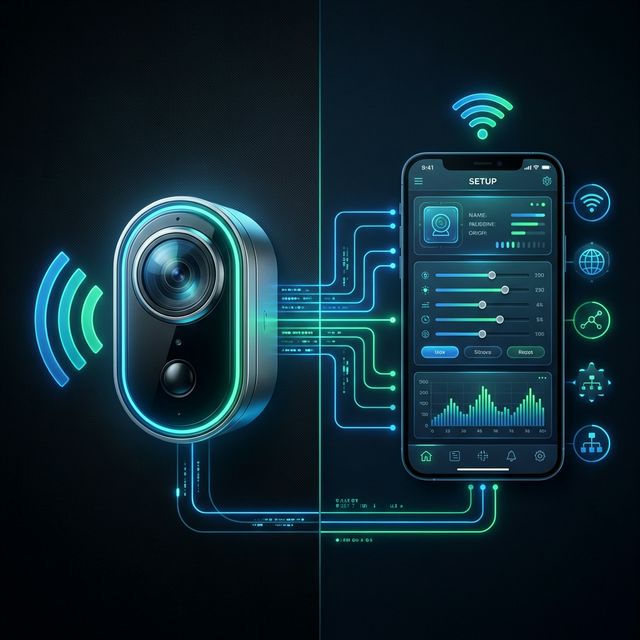 Concept: "The App Setup." Format: Mixed Media. Content: Split screen showing the physical device (camera) connecting to the App (screen recording). Goal: Reduce support tickets for setup.