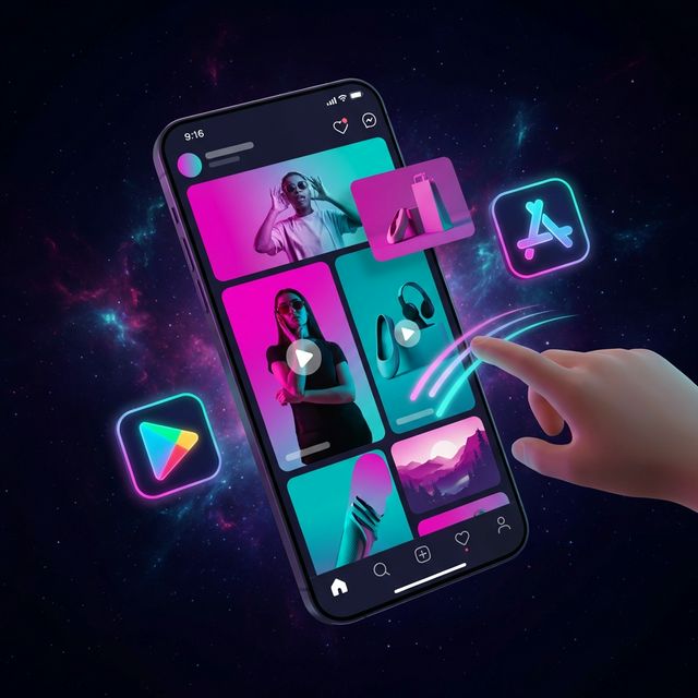 Concept: "The User Flow." Format: Vertical (9:16) inside an iPhone frame. Content: Swiping through the feed. Liking a post. Goal: App Store Install.