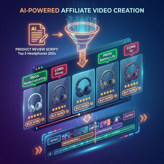 Scenario: "Top 5 Headphones 2024." Workflow: Paste the review script. Result: A comparison video showing clips of each headphone, with pros/cons text overlays and a "Buy Now" arrow.