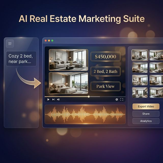 Scenario: "Listing Description." Workflow: Paste the Zillow description ("Cozy 2 bed, near park..."). Result: A slideshow video using the property photos, with smooth transitions, background jazz music, and text overlays of the price.